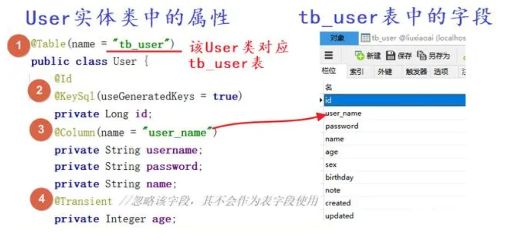 在通用mapper中,表名默认使用类名,驼峰转下划线。比如说tab_user表,我们在Java中可以使用TabUser这个类表示。但这样显然不太合适,我们一般都是用User实体类,那怎么办呢?