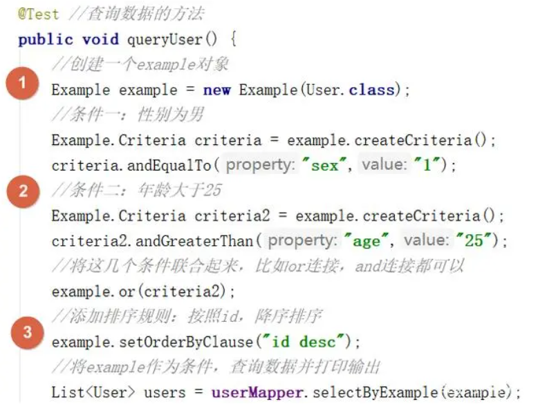 比如andEqualTo("sex","1")意思就是sex等于1的条件。比如andGreateThan("age","25")意思就是age大于25的条件。当然criteria对象也可以一直添加条件的,满足链式编程,条件是各种各样的,有很多种。