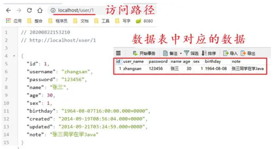 访问路径user/1,输入1即查询id为1的数据,若是输入2即查询id为2的数据。