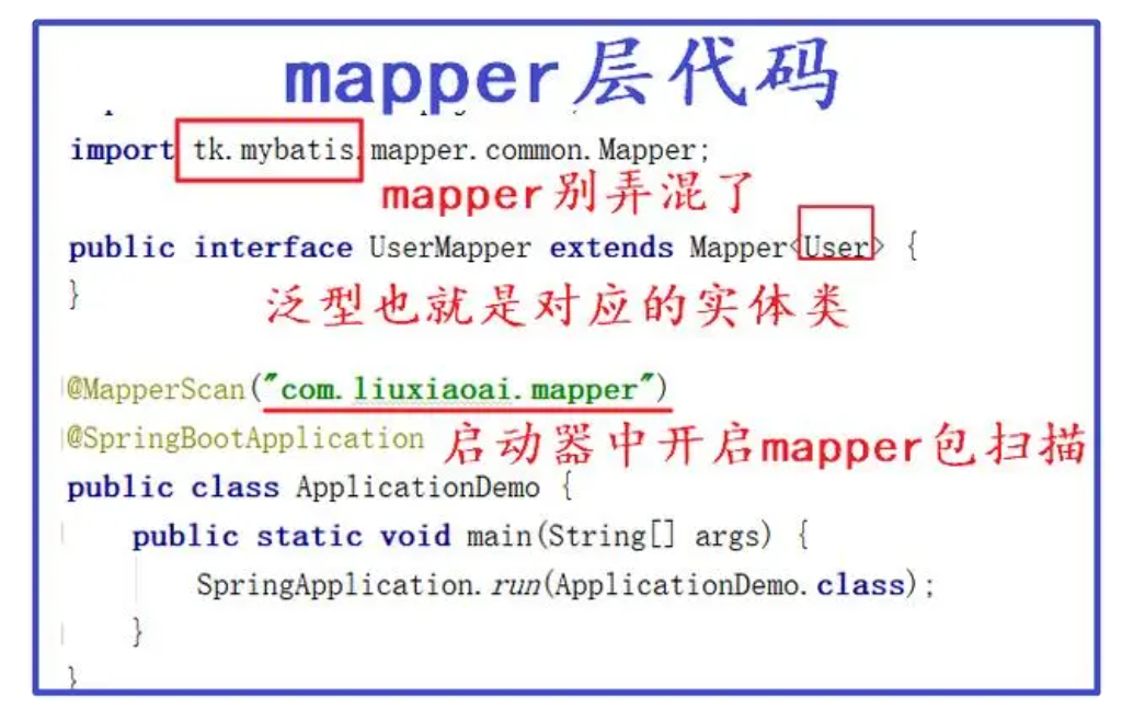 在启动类中使用@MapperScan开启mapper包扫描,因为我的mapper都是在com.liuxiaoai.mapper包中的,所以在该注解中说明即可。