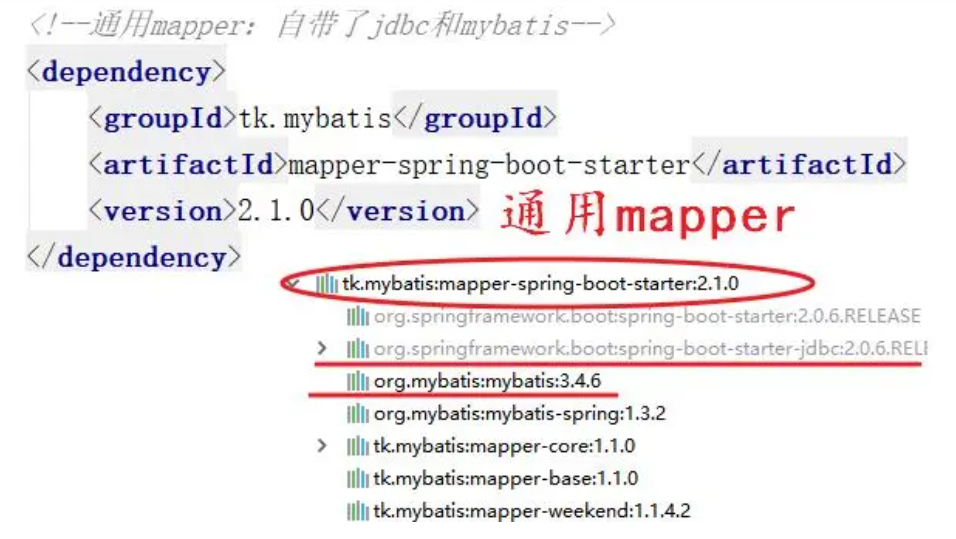 导入通用mapper启动器后,我们能发现其本身就包含了jdbc和mybatis的库。所以这两个的依赖就不用导入了。