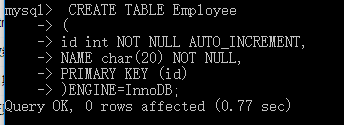 这张表包含两个字段,分别是‘id’和‘NAME’,'PRIMARY KEY (id)'语句指明该表的主键是'id',InnoDB是MySql 一个具体管理和处理数据的内部引擎。