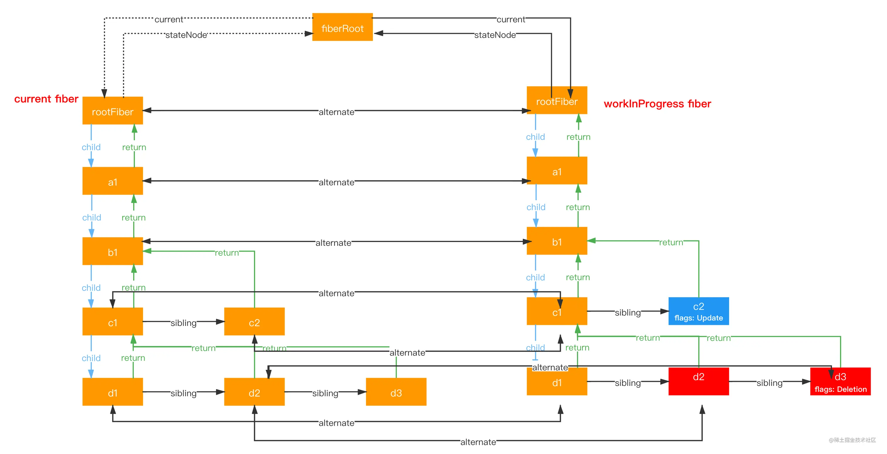 然后如上面所说,current fiber 和 workInProgress fiber 中对应的 alternate 会相互指向,然后 workInProgress fiber 完全创建完成后,fiberRoot 的 current 字段的指向会从 current fiber 中的 rootFiber 改为 workInProgress fiber 中的 rootFiber: