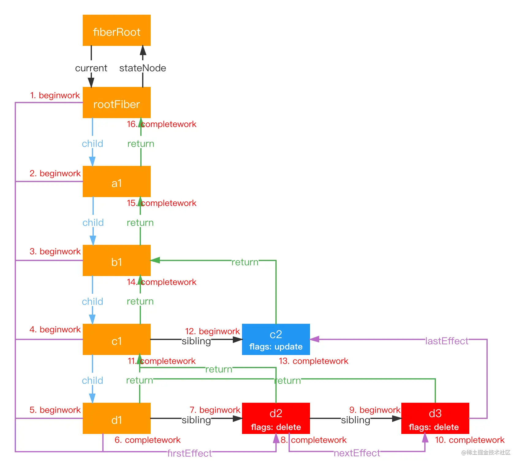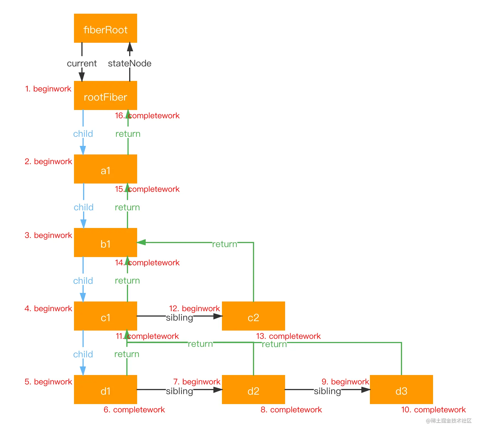react 对于 fiber 结构的创建和更新,都是采用深度优先遍历,从 rootFiber(此处对应id为root的节点)开始,首先创建 child a1,然后发现 a1 有子节点 b1,继续对 b1 进行遍历,b1 有子节点 c1,再去创建 c1 的子节点 d1、d2、d3,直至发现 d1、d2、d3 都没有子节点来了,再回去创建 c2.