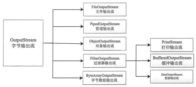 在 Java 中所有输出流类都是 OutputStream 抽象类(字节输出流)和 Writer 抽象类(字符输出流)的子类。其中 OutputStream 类是字节输出流的抽象类,是所有字节输出流的父类,其层次结构如图 4 所示。