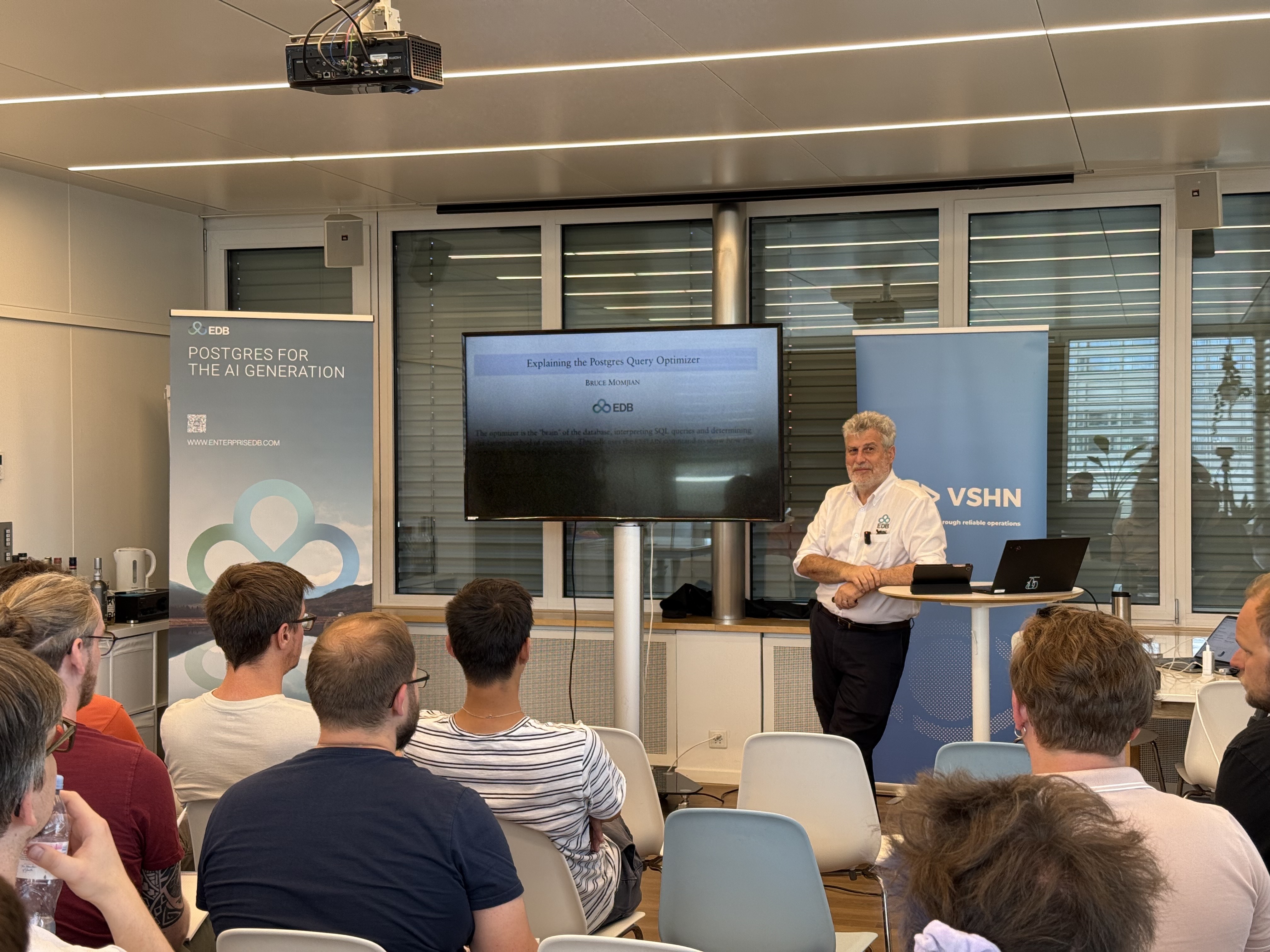 Bruce Momjian 的下一站是瑞士。他首先访问了日内瓦的一家 EDB 客户,随后在由 EDB 和 VSHN 联合举办的苏黎世讲座上发表演讲,VSHN 是瑞士首家获得 Kubernetes 认证的提供商。会场座无虚席,他发表了两场演讲:《解读 Postgres 查询优化器》和《超越连接和索引》,凸显了瑞士对开源精确性的兴趣。