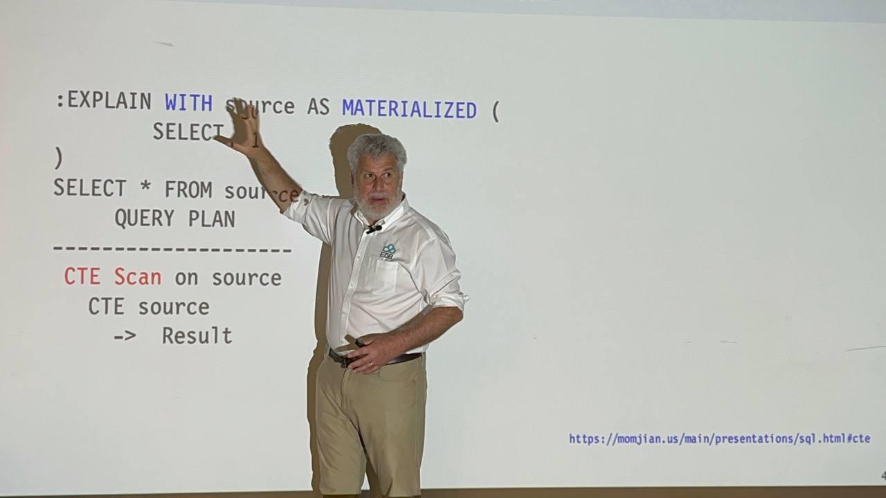 Bruce Momjian 的演讲《优化器从头到尾》涵盖了基于成本的查询规划、优化器统计、连接和索引。观众反复提出的一个问题——优化器的选择是否硬编码——让 Bruce Momjian 有机会解释系统如何使用配置定义的成本为每个查询计算动态选项。