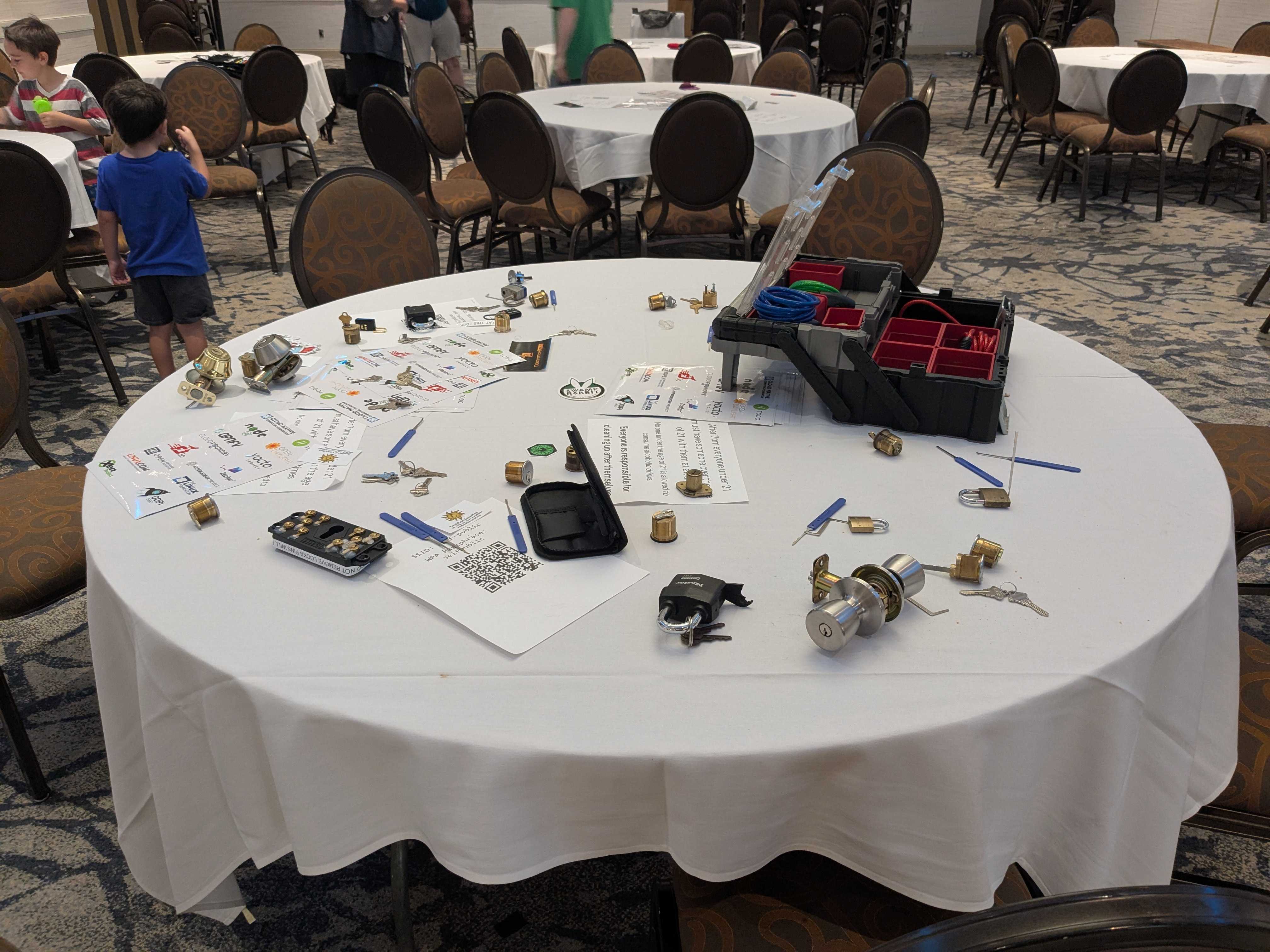 与会者在 SELF 的年度锁匠桌和业余无线电执照课程中将理论付诸实践,还有广受欢迎的“极客与枪支”射击场和烧烤晚宴。