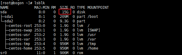 可以看到整个sda为15g,而sda1和sda2加起来为10g。