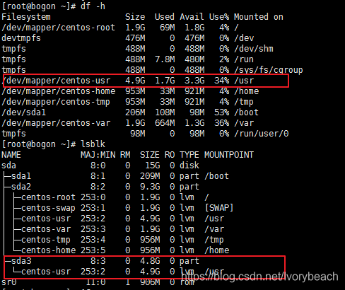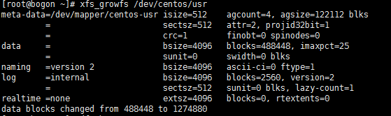 lvextend -L +3G /dev/centos/usr将3g的物理卷分配给/dev/centos/usr这个虚拟卷。此时/dev/centos/usr虚拟卷的大小会改变,但是df -h中/usr的大小没有改变。