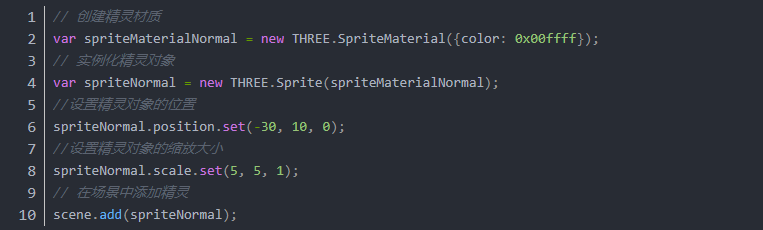 和精灵一起使用的还有一个THREE.SpriteMaterial对象,它是专门配合精灵的材质。注意:精灵没有阴影效果。
