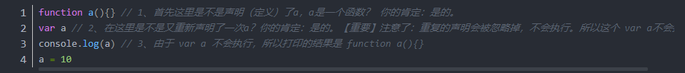 至此,以上我们就清晰的理解了,为什么以下这三行代码执行的结果是 function a(){}。