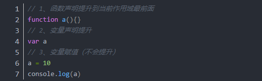 注意console.log(a)不会参与到预解析过程中,所以console.log(a)不会提升,预解析的过程只是涉及到变量声明提升和函数声明提升。