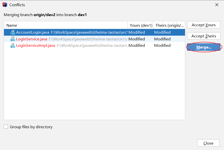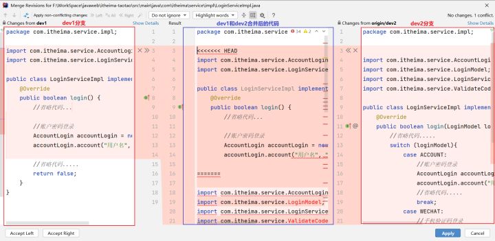 - 选择有代码冲突的类后,进行Merge(合并)