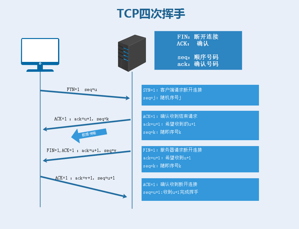 1️⃣ 客户端进程发出连接释放报文,并且停止发送数据。释放数据报文首部,FIN=1,其序列号为seq=u(等于前面已经传送过来的数据的最后一个字节的序号加1),此时,客户端进入FIN-WAIT-1(终止等待1)状态。TCP规定,FIN报文段即使不携带数据,也要消耗一个序号。