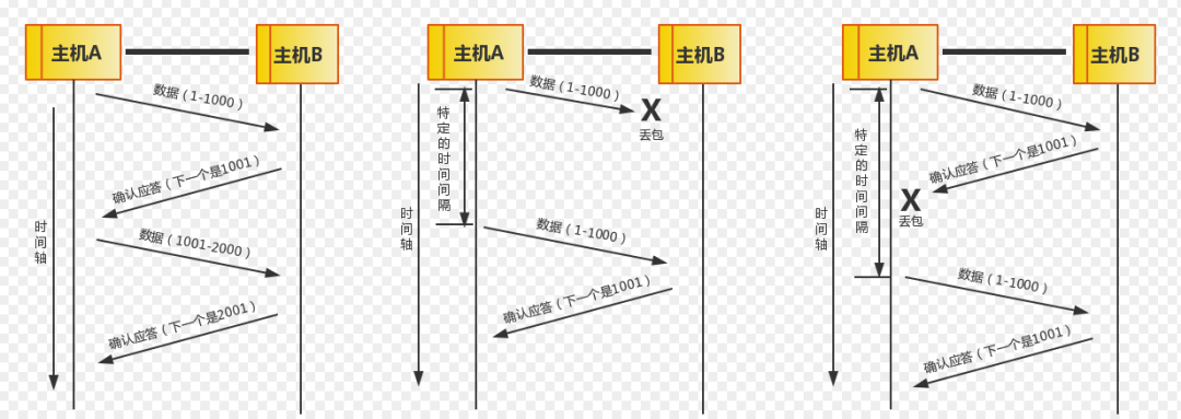 在一定时间内没有等待到确认应答,发送端就可以认为数据已经丢失,并进行重发。由此,即使产生了丢包,仍然能够保证数据能够到达对端,实现可靠传输。