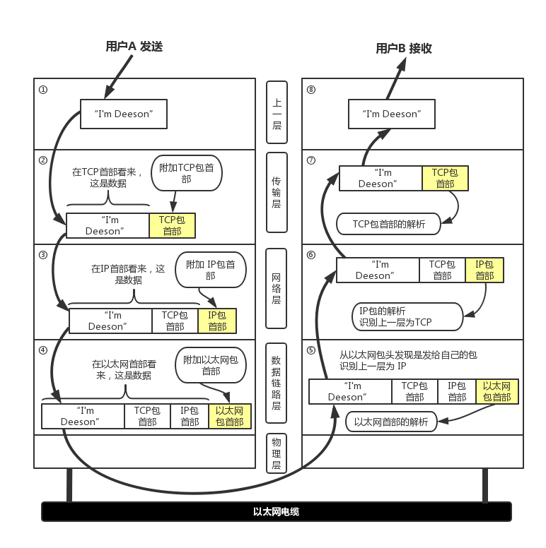 从 IP 传过来的 IP 包对于以太网来说就是数据。给这些数据附加上以太网首部并进行发送处理,生成的以太网数据包将通过物理层传输给接收端。