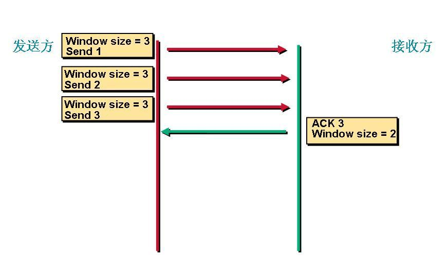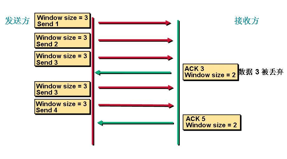 首先是第一次发送数据这个时候的窗口大小是根据链路带宽的大小来决定的。我们假设这个时候窗口的大小是3。这个时候接受方收到数据以后会对数据进行确认告诉发送方我下次希望手到的是数据是多少。这里我们看到接收方发送的ACK=3。这个时候发送方收到这个数据以后就知道我第一次发送的3个数据对方只收到了2个。就知道第3个数据对方没有收到。下次在发送的时候就从第3个数据开始发。这个时候窗口大小就变成了2 。