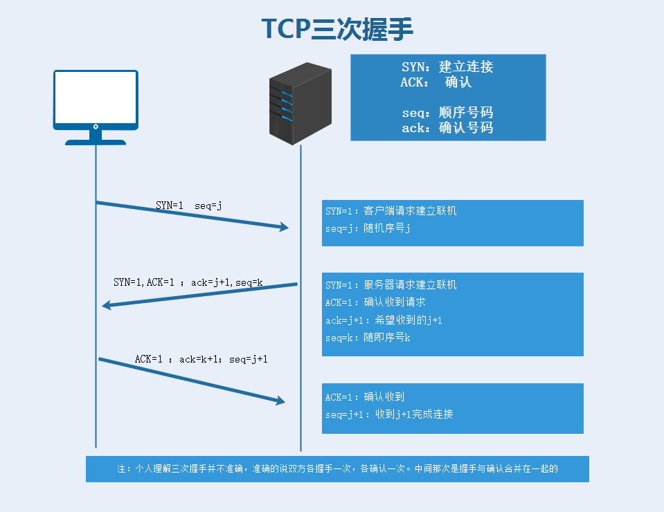 客户端收到确认后,检查ack是否为J+1,ACK是否为1,如果正确则将标志位ACK置为1,ack=K+1,并将该数据包发送给服务器端,服务器端检查ack是否为K+1,ACK是否为1,如果正确则连接建立成功,客户端和服务器端进入ESTABLISHED状态,完成三次握手,随后客户端与服务器端之间可以开始传输数据了。