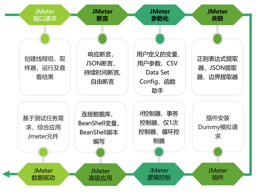 JMeter工具分层讲解,项目场景实操深化应用,从基本请求到高级使用,边学边练快速掌握JMeter关键技术。学习过程贯穿企业