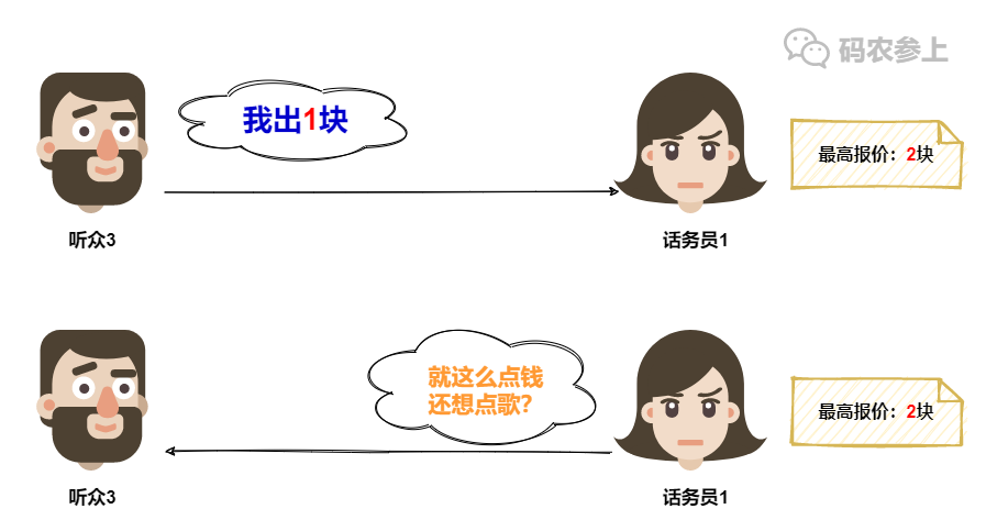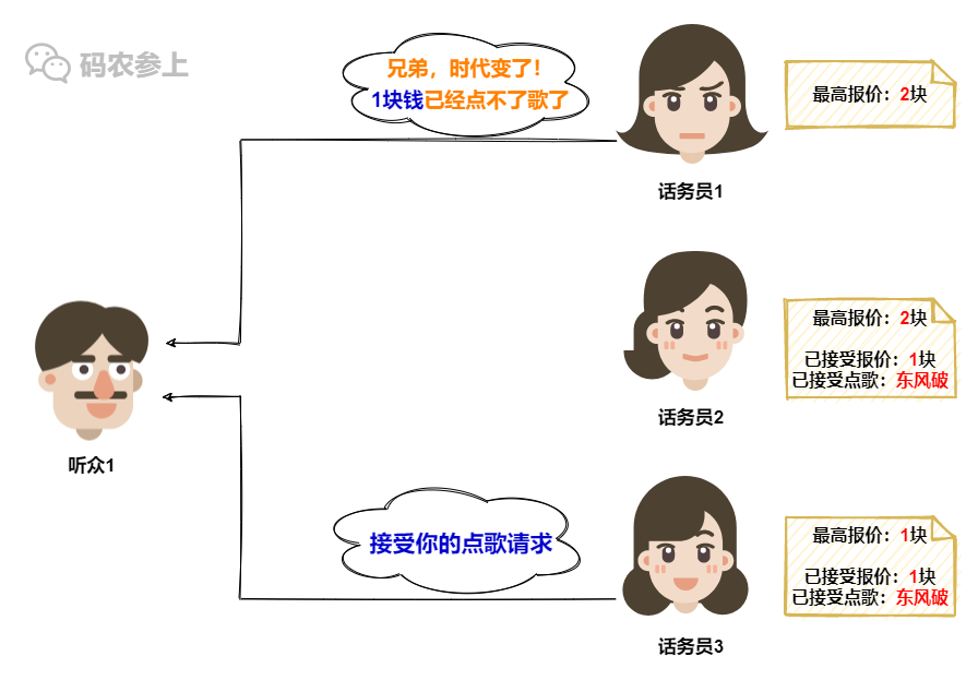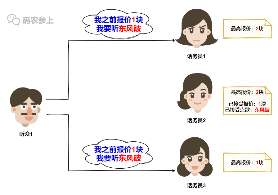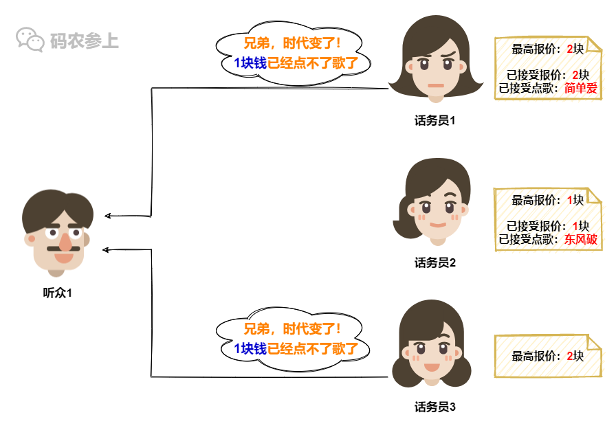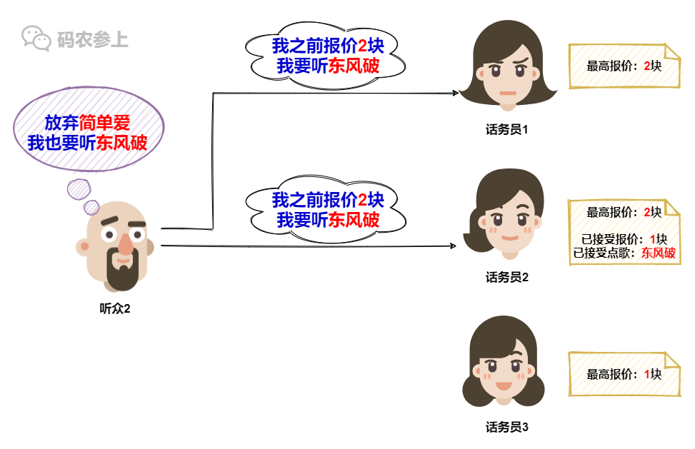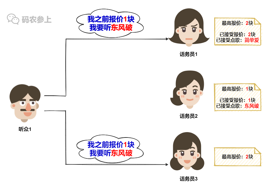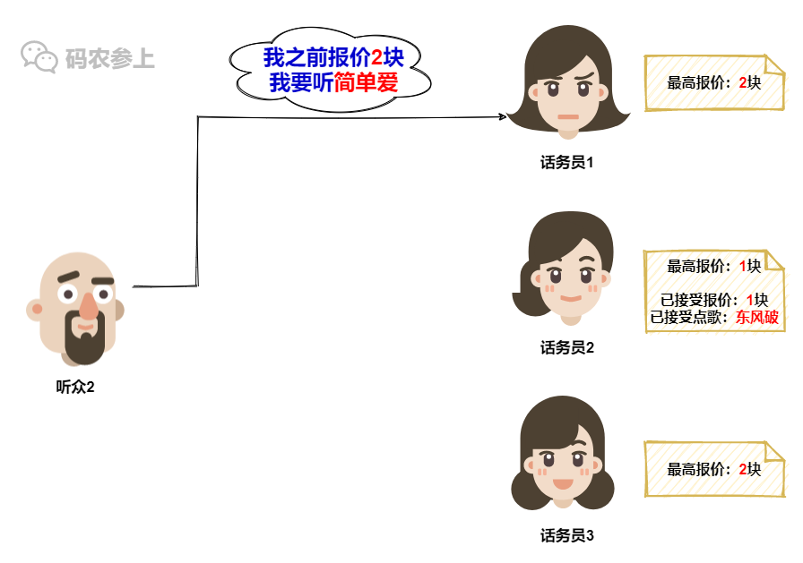 但是话务员1这就不一样了,她所认可的报价已经涨到了2,所以旧的1块钱报价已经不能在她这里点歌了,因此话务员1会拒绝听众1的点歌请求。