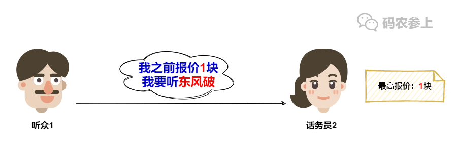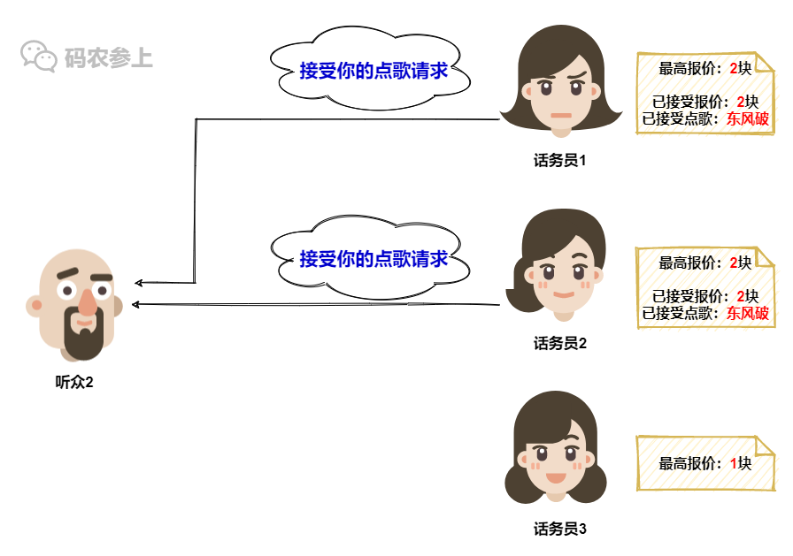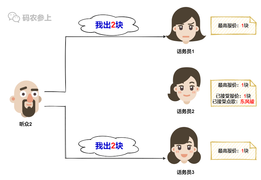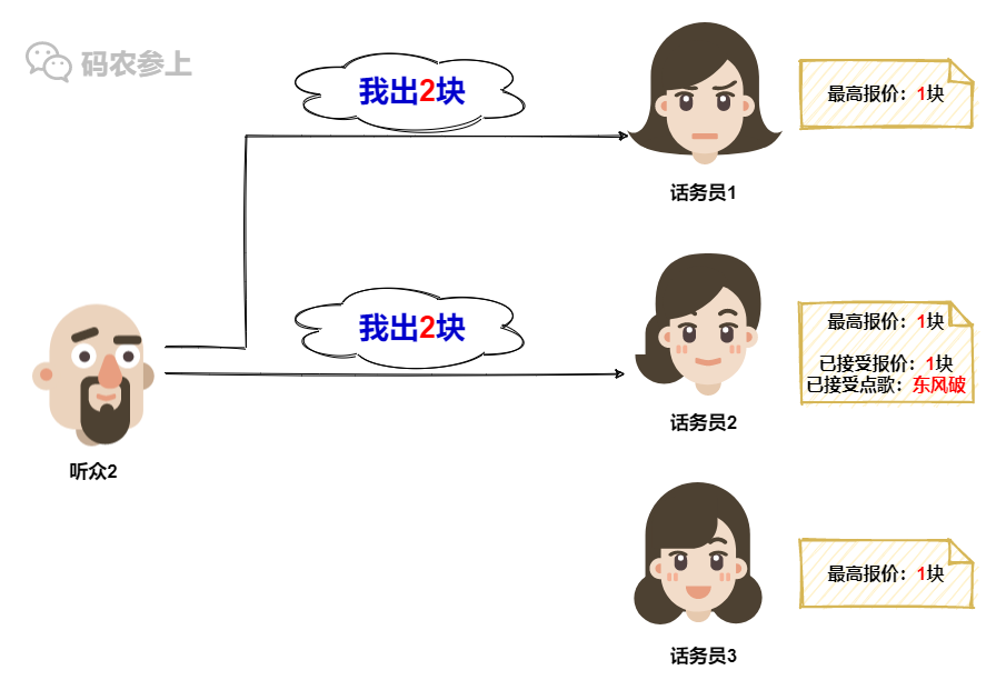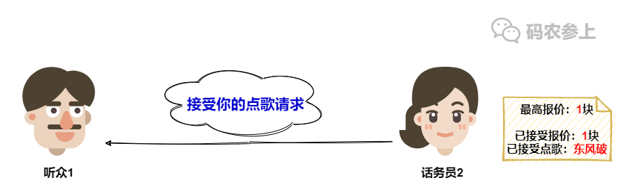 在收到听众1的点歌请求后,话务员2看到听众1在请求中携带的之前报价是1块,满足大于等于自己记录的最大报价这一条件,于是果断接受听众1的点歌请求。