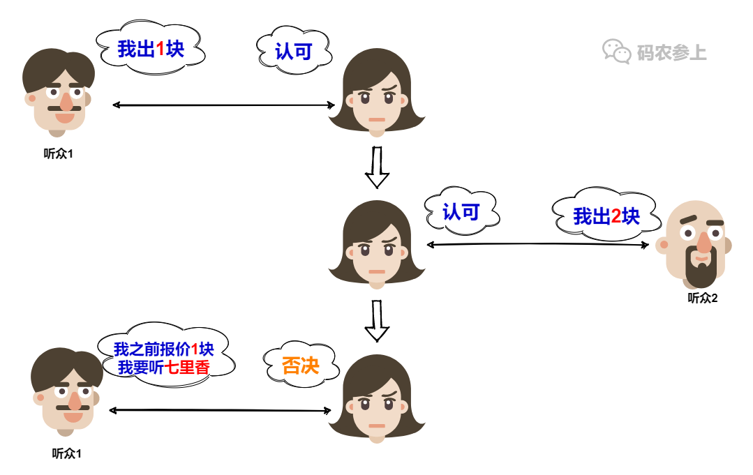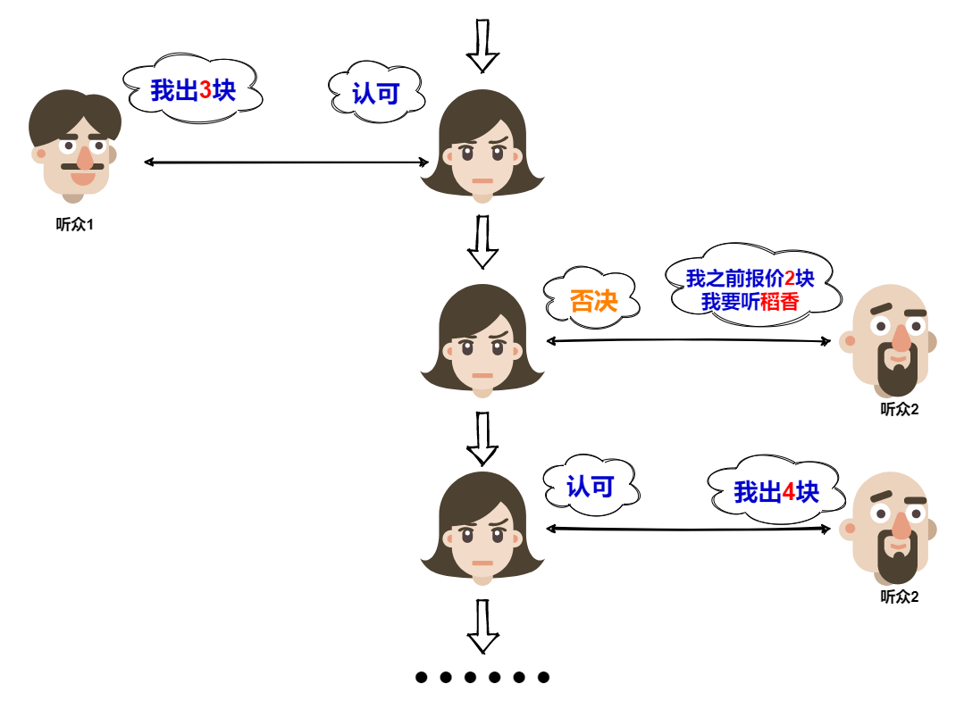 无奈,听众1只能回到第一阶段,从报价开始再重头走一遍流程。并且这次,他把报价提升到了3块。