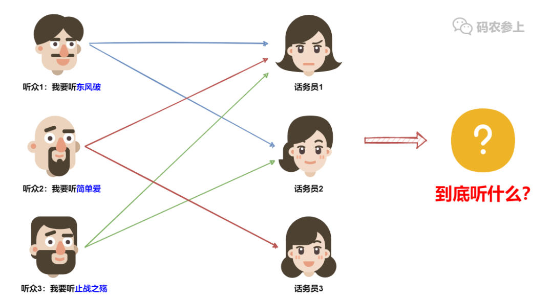 既然是电台热线,那么肯定不只有一个话务员了,我们假定这个电台同时存在3个话务员,并且她们之间是相互没有交流的,那么当短时间内打进来很多电话时,要怎么决定放哪首歌呢?