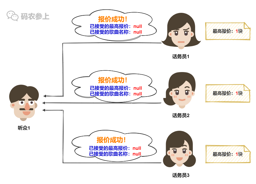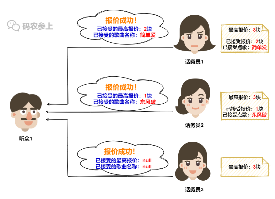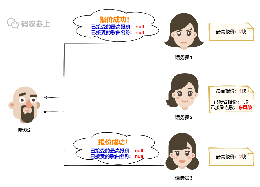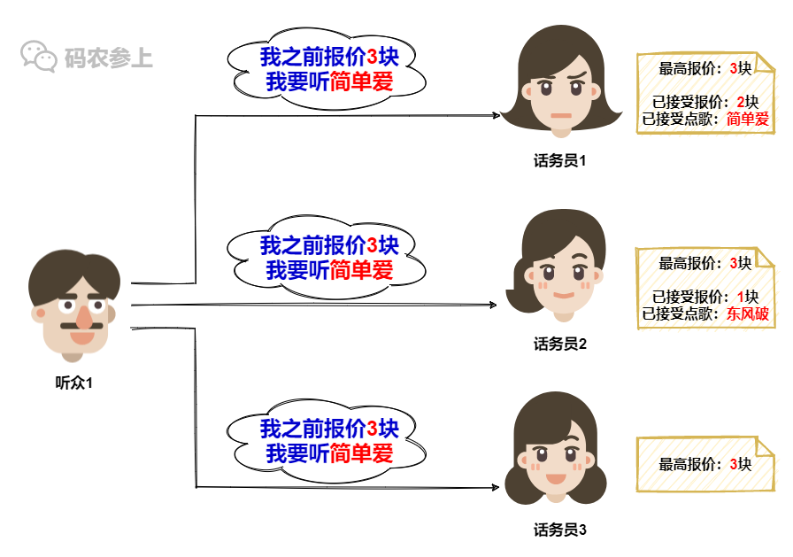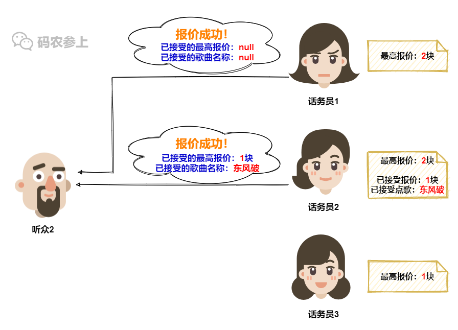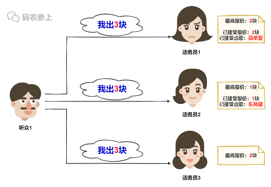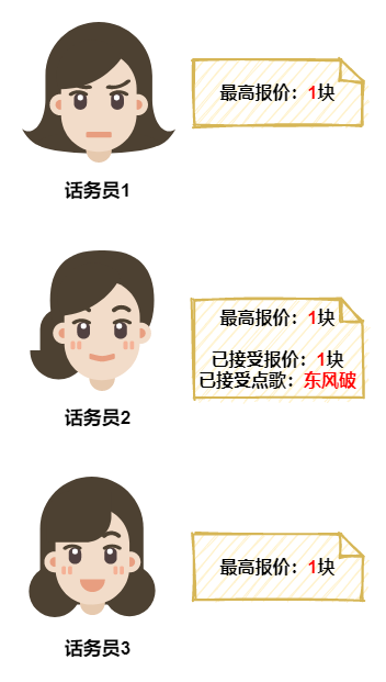 在话务员3这里,她记录的最高报价还是听众1之前的1块,所以没有意外,话务员3会接受听众1的点歌请求,并更新本地的记录信息。