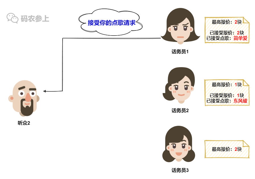 在接受点歌请求后,话务员2要记录的东西又要增加了,她不但要记住已接受的请求的报价金额,还要记住已接受请求的点播歌曲。然后给听众1一个回复,表示我已经接受了你的点歌请求。
