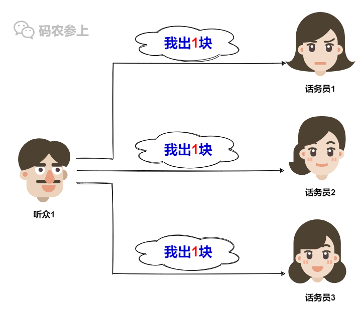 如果这时候,再来一个听众3打进电话,并且尝试以两块或以下的价格进行报价给前两个话务员的话,那么他的报价不会得到话务员的认可。