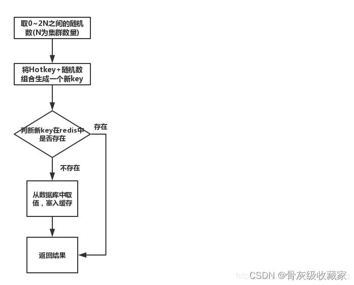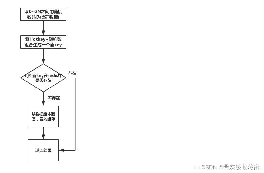 这个方案也很简单。不要让key走到同一台redis上不就行了。我们把这个key,在多个redis上都存一份不就好了。接下来,有热key请求进来的时候,我们就在有备份的redis上随机选取一台,进行访问取值,返回数据。假设redis的集群数量为N,步骤如下图所示