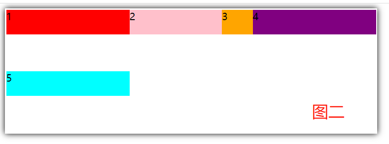 如图一:3后面还有一点空间,给3设置flex:1 1 0; 要注意此时主轴是自左而右的,所以3是没有宽度,但是有内容,所以是会被内容撑开一点空间,此时效果如图二,4会上去,占用空间,3有多少空间,就要看横向父元素还剩下多少空间,现在4的空间是200px全部展示,3的空间是50px,如果给4设置宽度为250px,那么4就不会上到第一行,因为放不下。如图三,剩下的空间都是3的。