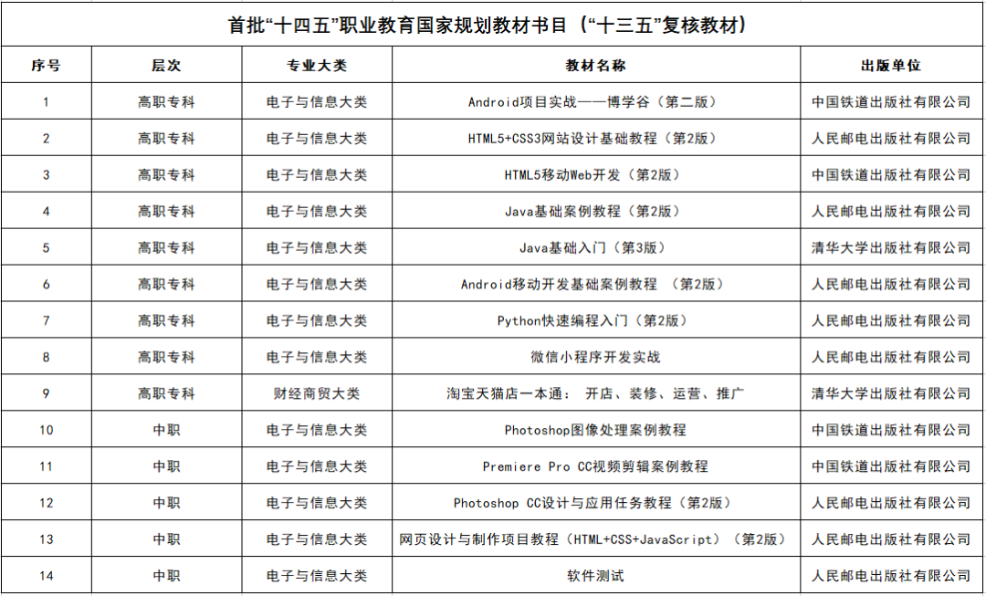 从公布的名单可知,14 部教材主要涵盖电子与信息、财经商贸等大类,涵盖Java基础、Python入门、网页设计、图像处理、前端开发、Android移动端开发、软件测试、电商运营及相关案例实践等。