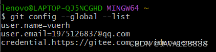 以上命令执行结束后,可用git config --global --list命令查看配置是否成功