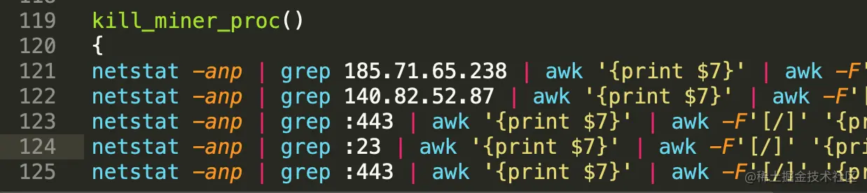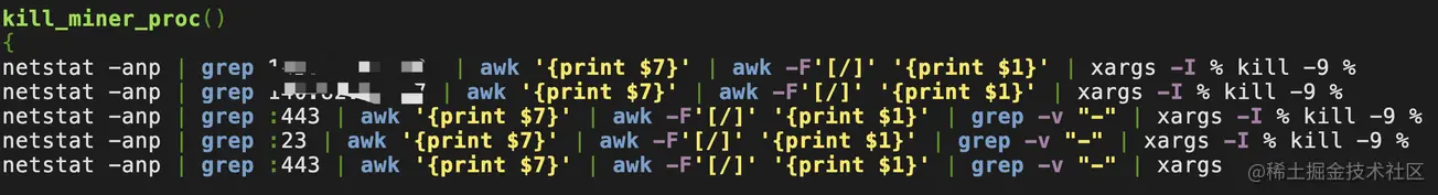 {却没有},看函数意思是删除主程序进程, netstat -anp显示各种网络相关信息,grep进行ip或者端口查找,定位到行,awk按指定设置输出对应文本,比如awk '{print $7}'按空格/tab为界限输出文本中的第七项内容,|是管道命令,作用是将左侧命令执行结果作为参数传递给右侧命令执行(需要经过xargs转换),xargs可以将管道命令的左侧执行结果转换成命令行参数,传递给右侧命令执行