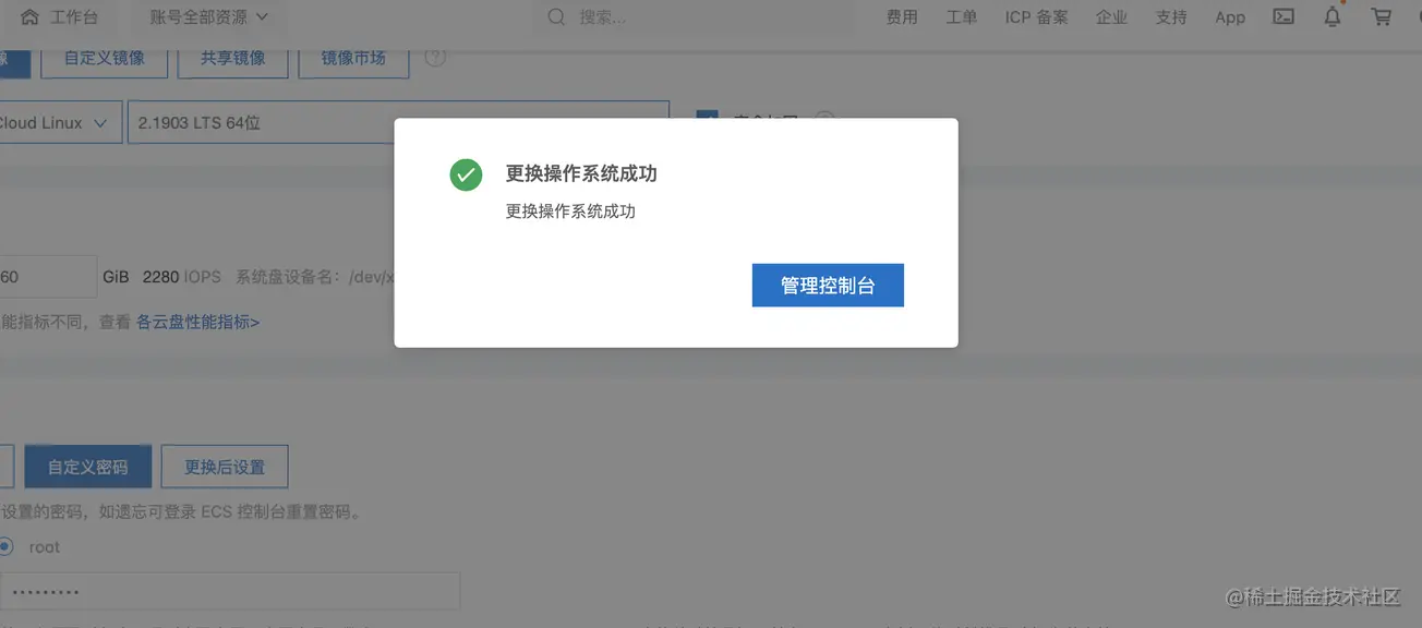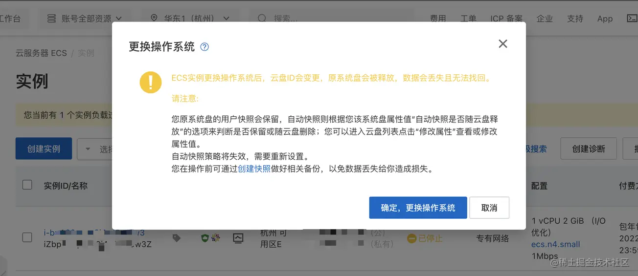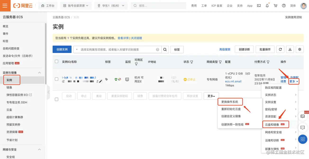 重置系统的话就相对会简单很多,进入到阿里云控制台,然后找到对应实例,先停止服务器,然后点击更多 -> 云盘和镜像 -> 更换操作系统。