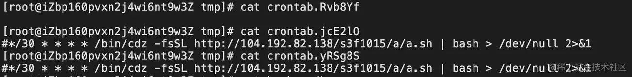 那我们就继续来研究下前面找到的crontab问题,首先进入到/tmp目录下,查看所有crontab相关文件内容~