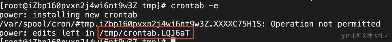 我退出后,他还显示我没有修改权限?他奶奶的~可以使用ls -l /tmp/crontab.LQJ6aT查看文件权限所属人,当然可以直接用sudo指令强制修改或者删除。
