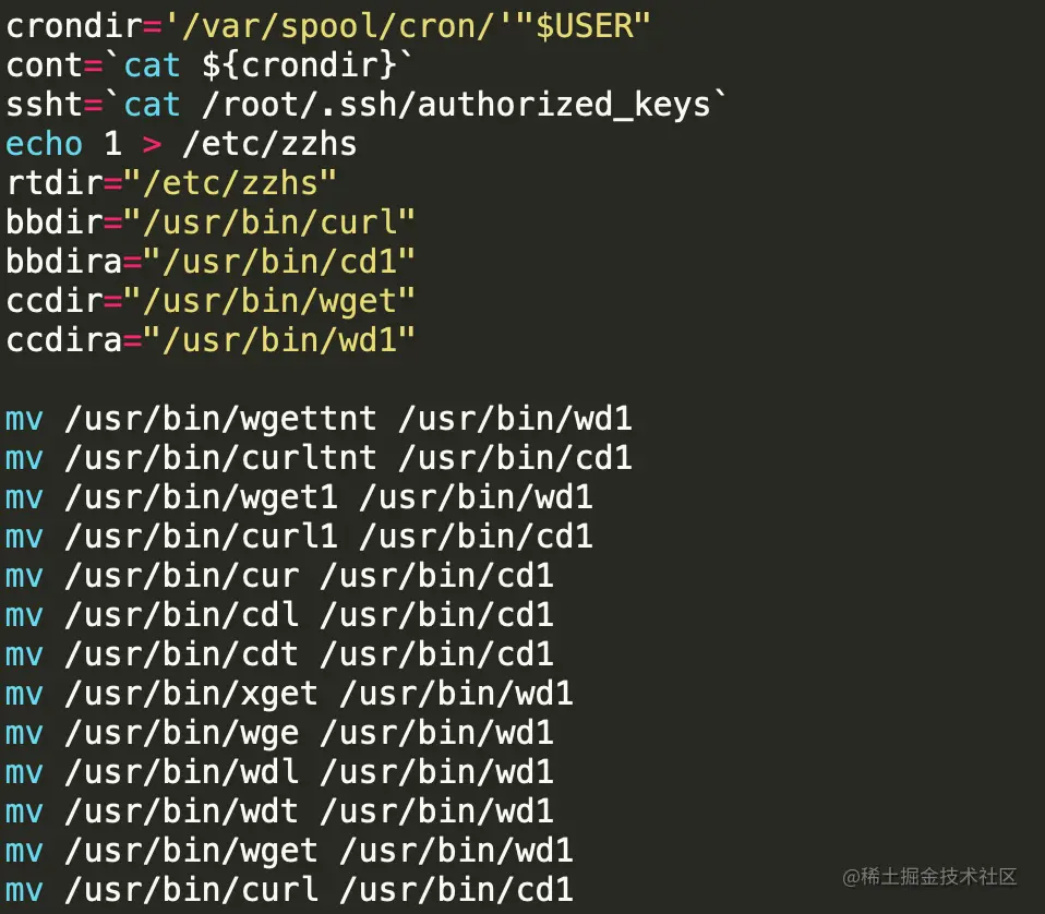 接下来我们来一起看看,他这个脚本都做了些什么(老表我对linux相关操作并不熟悉,所以以下关于脚本文件的简单分析难免会有不正确或者错误的地方,敬请大家批评指正,但不可恶意攻击~):