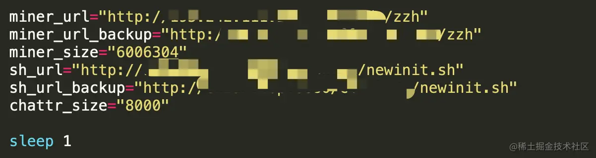(默认是使用vim编辑器,如果要退出编辑模式,可以先按ESC,再输入:qw 回车即可退出,Linux相关操作具体可以看拥有有一台服务器后,我竟然这么酷?)进入文件编辑,虽然指令不怎么能看懂,但是看到了一个网址、一个ip地址,首先非常确定这个ip不是我目前登录的这个服务器的,而且看整理链接,应该是下载了一个a.sh文件,有点矿味了~