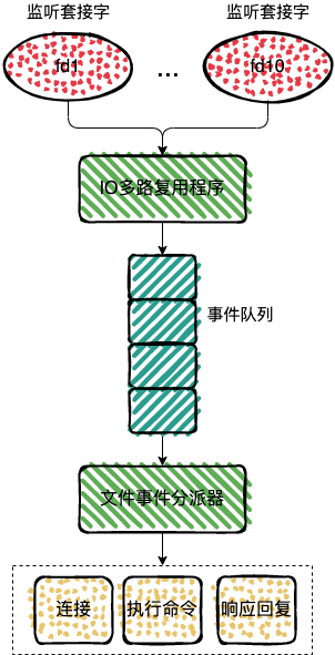 虽然多个文件事件可能会并发出现,但 IO 多路复用程序总会将所有产生事件的 socket 放入一个队列中,通过这个队列,有序的把这些文件事件通知给文件分派器。