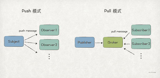 实现观察者模式和发布-订阅模式时,都会涉及到 Push 模式 或 Pull 模式 的选取。所谓 Push 模式,指的是 Subject/Publisher 直接将消息推送给 Observer/Subscriber;所谓 Pull 模式,指的是 Observer/Subscriber 主动向 Subject/Publisher 拉取消息: