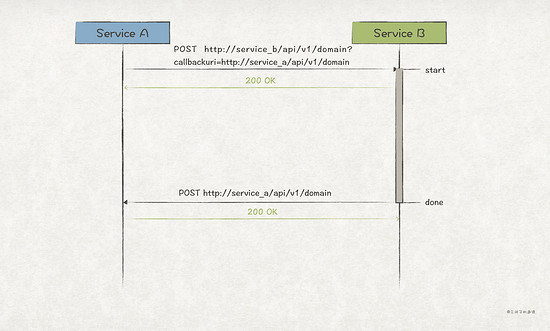 2、Service A 在请求 Service B 接口时带上 callback uri,比如 http://service_b/api/v1/domain?callbackuri=http://service_a/api/v1/domain,Service B 收到请求后立即返回 HTTP Status 200 Ok,等任务完成后再调用 Service A callback uri 进行通知。