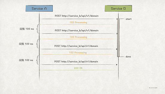1、Service A 隔一段时间调用一次 Service B 的接口,如果任务还没完成,就返回 HTTP Status 102 Processing;如果已完成,则返回 HTTP Status 200 Ok。