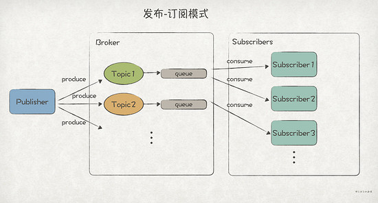 在发布-订阅模式中,我们将发布方称为 Publisher ,订阅方称为 Subscriber ,不同于观察者模式,Publisher 并不直接持有 Subscriber 引用,它们之间通常通过 Broker 来完成解耦。也即,Publisher 不知道有哪些 Subscriber,也不知道 Subscriber 的数量: