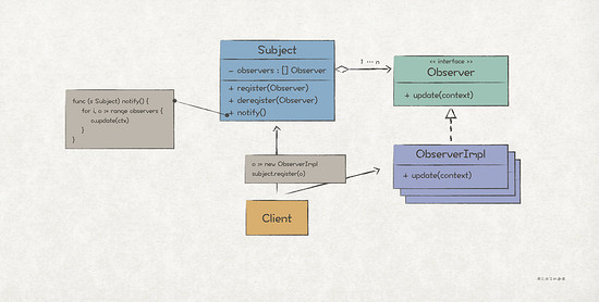 - 为 Subject 对象定义注册 Observer 的方法,上述例子为 AddListener 方法。