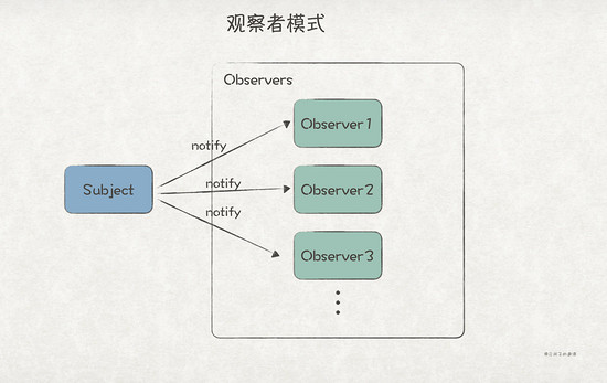 我们将观察者称为 Observer ,被观察者(或主体)称为 Subject ,那么 Subject 和 Observer 是一对多的关系 ,当 Subject 状态变更时,所有的 Observer 都会被通知到。