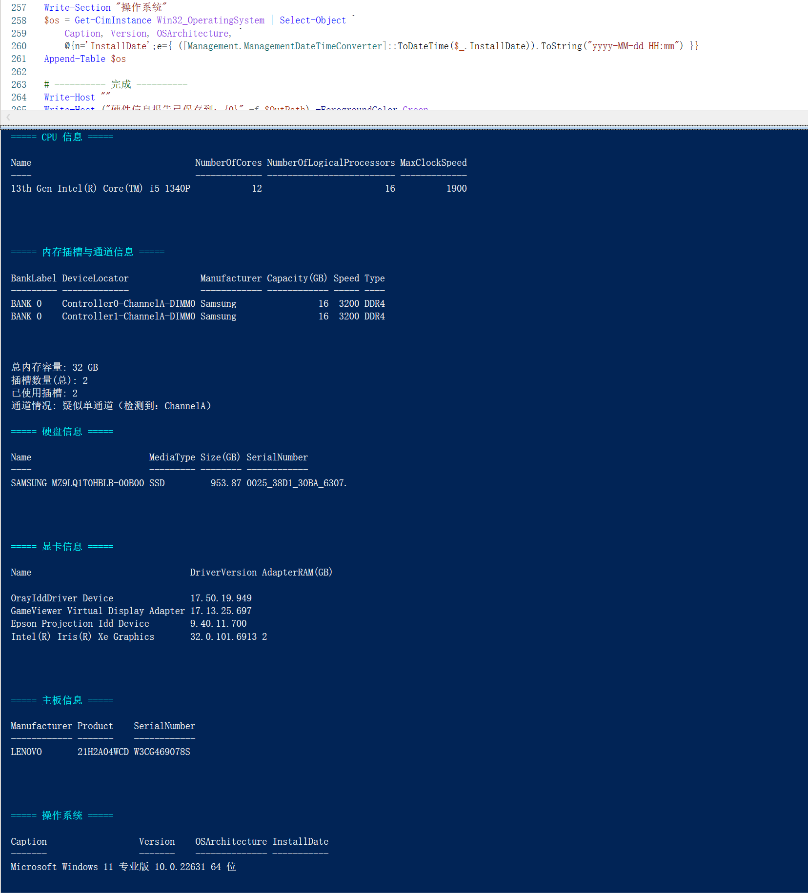 "硬件信息报告已保存到:$OutPath" | Out-File -FilePath $OutPath -Append -Encoding UTF8