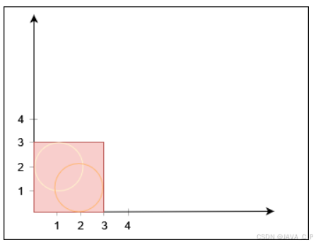 输入:X = 3, Y = 3, circles = [[2,1,1],[1,2,1]]